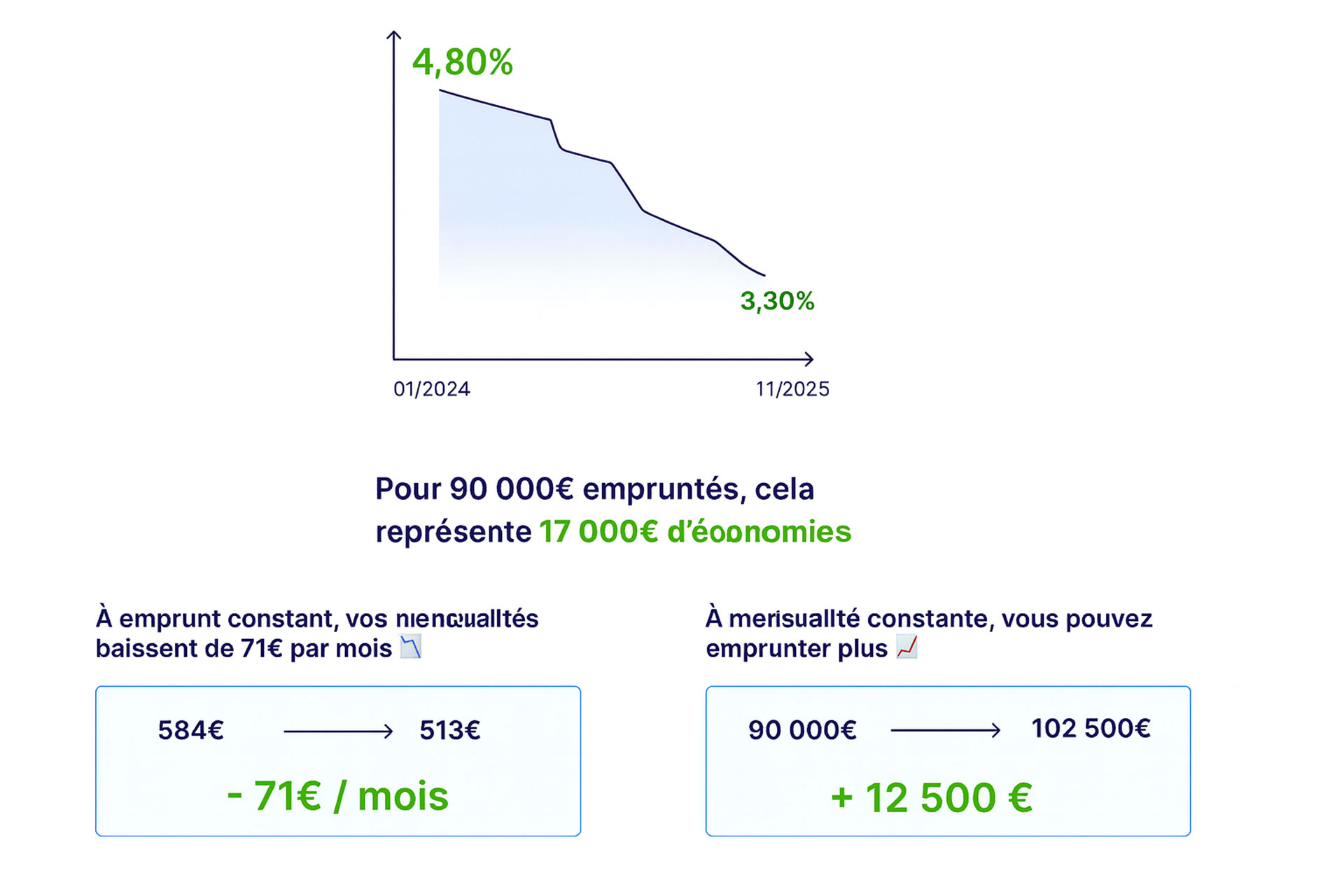 Entre janvier 2024 et novembre 2025, le marché du crédit immobilier a connu une évolution majeure. Les taux d’intérêt sont passés de 4,80% à 3,30%, soit une diminution de 1,50 point de pourcentage. Cette baisse représente bien plus qu’un simple chiffre sur le papier : elle se traduit par des économies concrètes et substantielles pour votre projet d’extension.