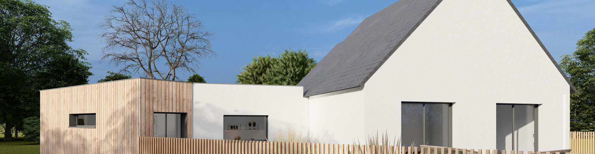 L’extension conçu par Extenbois, extension maison Lorient, sera implantée en limite de propriété, comme le montre le plan. Cette implantation optimise l’espace disponible sur la parcelle tout en préservant les zones extérieures existantes. Le projet présenté sur les différentes perspectives s’intègre harmonieusement à la maison traditionnelle existante tout en apportant une touche contemporaine grâce à ses matériaux.