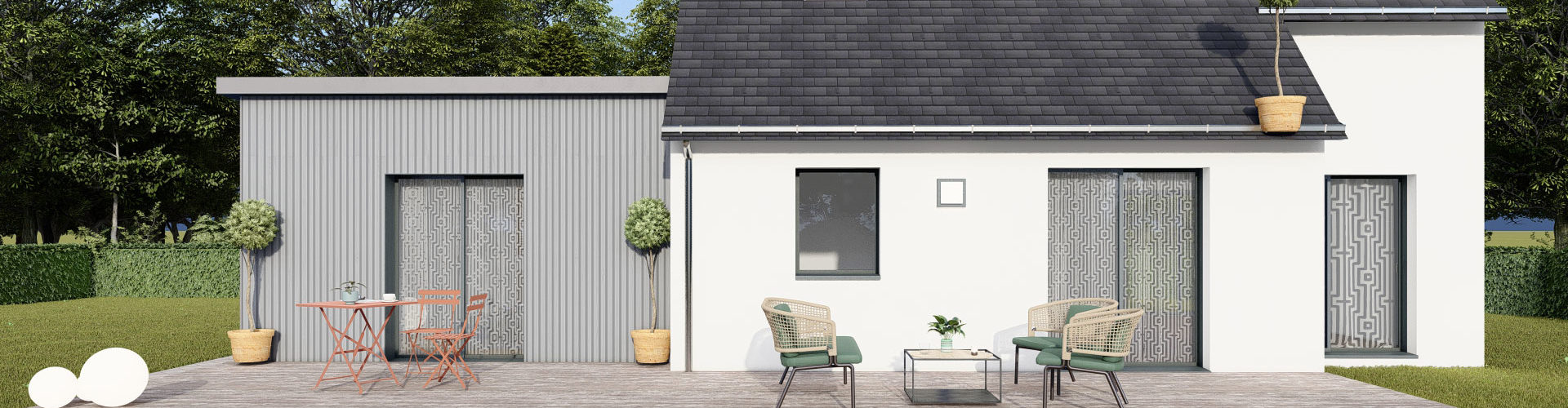 L’extension latérale permet d’optimiser l’emprise au sol disponible sans empiéter sur le jardin principal, une solution particulièrement adaptée aux configurations de terrain rectangulaires.