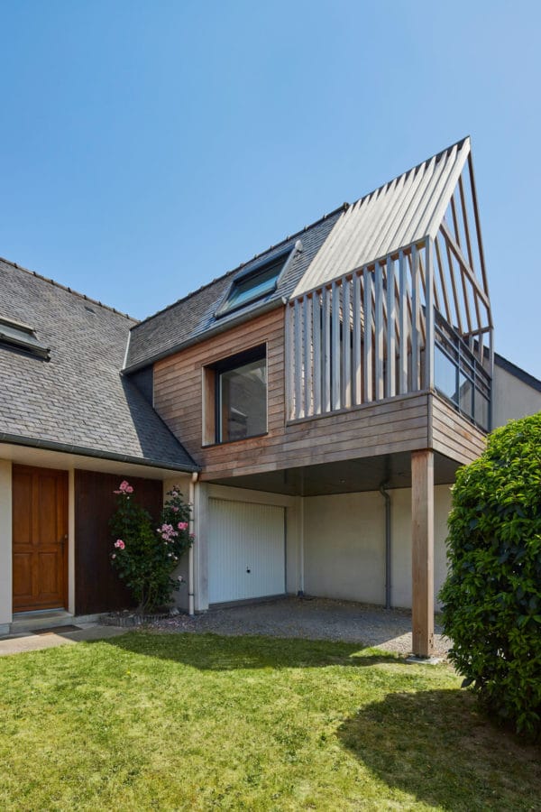 Une pergola a été ajoutée dans le prolongement de la chambre à l’étage et un carport a été intégré en partie basse. De nombreuses fenêtres rendent cette extension ultra lumineuse. Le bardage de l’extension est en Red Cedar abouté, la toiture en ardoises est similaire à l’existante et les gouttières à la nantaise ont été prolongées pour rendre cette extension la plus naturelle possible.